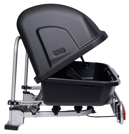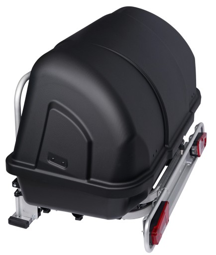 Box bagażowy zamocowany jest na szynach umożliwiających wysuwanie i wsuwanie boxa przez co zmniejszono przestrzeń zajmowaną za samochodem. Przydatne rozwiązanie podczas manewrowania oraz na parkingu i w garażu.