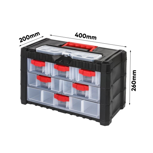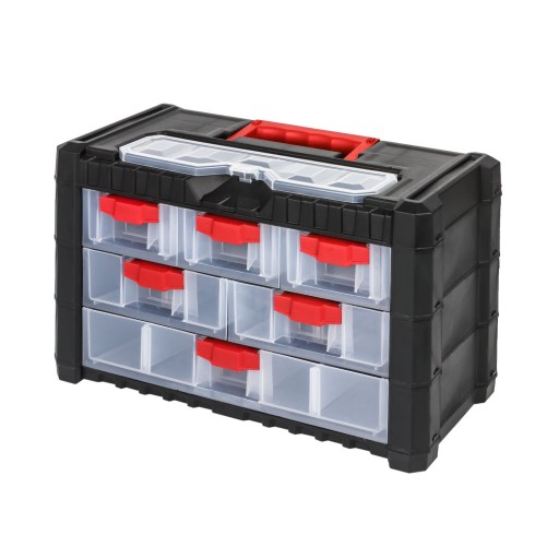 Organizer Multicase Cargo doskonale sprawdzi się w pracowni, magazynie czy warsztacie. Otwory w tylnej części obudowy skrzynki pozwalają na zawieszenie również na ścianie. NS301 wyposażony został w praktyczną rączkę do przenoszenia. W tym modelu znajdziemy: 3 małe, 2 średnie i 1 duża szufladkę, a także praktyczny organizer na najmniejsze przedmioty.