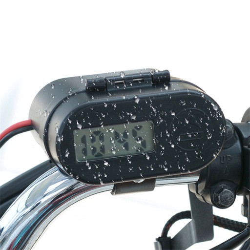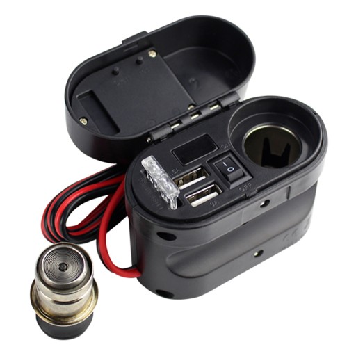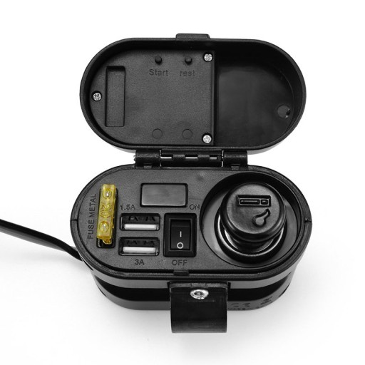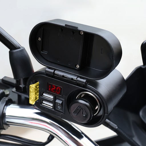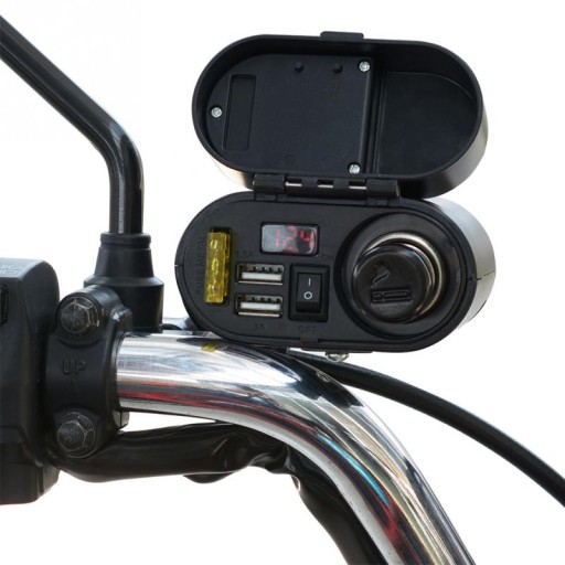 Wodoodporne gniazdo zapalniczki do motocykla, skutera, quada. Wyposażony w woltomierz pokazujący napięcie ładowania akumulatora. Dodatkowo dwa mocne porty USB 5V 3.1A oraz zegarek.