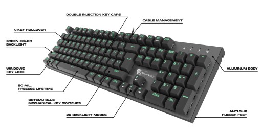 Pełnowymiarowa i funkcjonalna klawiatura mechaniczna, daje graczowi przewagę już od pierwszych sekund rozgrywki. Szybka i precyzyjna reakcja, pewny klik i kontrola pod palcami, pozwalają na szybkie granie i skuteczne rażenie przeciwników, dzięki zastosowaniu mechanicznych przełączników wysokiej jakości.