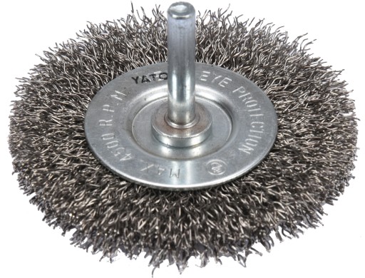 Szczotka rotacyjna przeznaczona do czyszczenia i polerowania powierzchni metalowych, powłok malarskich, a także do usuwania rdzy i czyszczenia narzędzi, przy użyciu szlifierki.