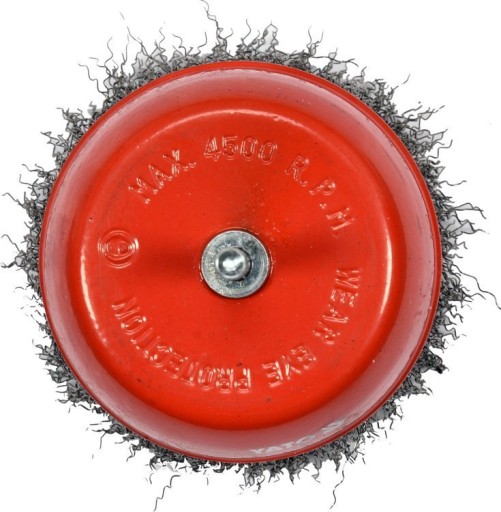 Szczotka rotacyjna przeznaczona do czyszczenia i polerowania powierzchni metalowych, powłok malarskich, a także do usuwania rdzy i czyszczenia narzędzi, przy użyciu szlifierki.