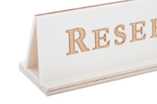 10x - Dwie Drewniane tabliczki przymocowane do solidnej podstawki z wyraźnymi grawerowanymi napisami REZERWACJA / RESERVATION.