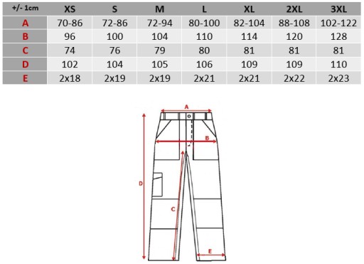 - Kieszenie: dwie poniżej pasa z przodu na zamek kostkowy, dwie kieszenie na nogawkach po zewnętrznych stronach ud (obie na zamek kostkowy, na lewej kieszeni miejsce na telefon, na prawej druga mniejsza na rzep), dwie kieszenie klasyczne z tyłu (bez klapek).