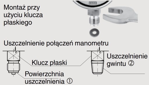 Zgodnie z ogólnymi przepisami technicznymi dotyczącymi manometrów (np. EN 837-2). Podczas przykręcania przyrządu nie wolno naciskać na obudowę ani pokrywę - siła może być przyłożona jedynie do powierzchni pod klucz za pomocą odpowiedniego narzędzia. Prawidłowe uszczelnienie na powierzchni uszczelnienia musi być wykonane z odpowiednich podkładek, pierścieni lub profili uszczelniających. W przyłączach procesowych z gwintem stożkowym (np. NPT) uszczelnienie musi być dokonane w gwincie za pomocą dodatkowego materiału uszczelniającego, np. taśmy PTFE (EN 837-2). Moment dokręcania zależy od zastosowanego uszczelnienia. Aby zapewnić jak najlepszą widoczność przyrządu pomiarowego można wykorzystać gniazdo zaciskowe lub nakrętkę łączącą. W przypadku podłączenia do manometru urządzenia przedmuchującego należy zabezpieczyć je przed zablokowaniem wiórami i zanieczyszczeniami.