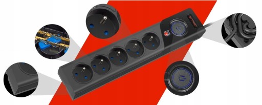 Listwa zasilająca posiada pięć gniazd sieciowych z uziemieniem wyposażonych w nowatorski system Child Protection, uniemożliwiający dostęp dzieci do elementów będących pod napięciem. Natomiast bezpiecznik automatyczny o charakterystyce zwłocznej 10A/250V umożliwi ponowne załączenie zasilania w przypadku wystąpienia awarii typu zwarcie/przeciążenie, po usunięciu przyczyny tego stanu.