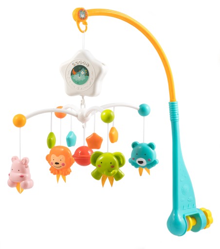 Kolorystyka karuzeli przyciąga uwagę niemowląt. Zawieszki w kształcie zwierzątek są odpinane, mogą służyć dziecku za samodzielne zabawki.
