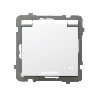 Gniazdo pojedyncze hermetyczne z uziemieniem podtynkowe oraz przesłonami torów prądowych kolorze Białym z klapką Białą