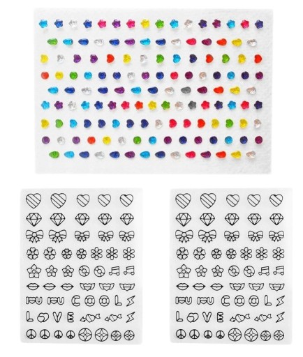Do zestawu dołączono 7 odkręcanych lakierów do paznokci, które po nałożeniu małej igiełki mogą być również precyzyjnymi pisakami, którymi można samodzielnie narysować wzorek lub wypełnić naklejki znajdujące się w opakowaniu. Kolory lakierów: