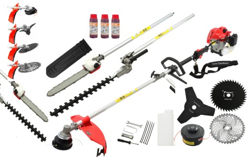 KOSA SPALINOWA 6W1: kosa na tarczę tnącą, wykaszarka na głowicę żyłkową, piła łańcuchowa, nożyce do żywopłotu, tarcza widiowa, tarcza zwykła