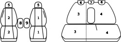 Każdy element pokrowca został oznaczony numerem. Ponumerowane części należy dopasować do elementów tapicerki według załączonego schematu.
