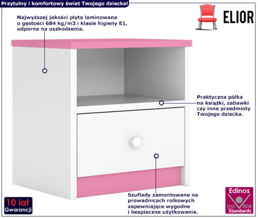 Meblowanie pokoju dziecięcego to prawdziwe wyzwanie dla każdego rodzica. Dobrze zagospodarowane wnętrze to funkcjonalne wnętrze. Marka Elior z troski o swoich najmłodszych klientów uzupełniła kolekcję mebli Happy o jeszcze jeden produkt. Tym razem jest to szafka nocna Happy 4X. Solidne wykonanie, troska o każdy, nawet najmniejszy szczegół, najwyższa jakość materiałów to elementy składowe mebla, który posłuży Twojemu dziecku przez wiele długich lat. Marka Elior tworzy meble z pasją, ze szczególną dbałością o ich estetykę i funkcjonalność. Happy 4X to produkt z solidnych materiałów. Szafka została wykonana z wysokogatunkowej płyty meblowej laminowanej o grubości 18 mm, klasie higieny E1 i podwyższonej gęstości 684, 8 kg/m3 wg badania normy EN 323. Wszystko to sprawia, że mebel prezentuje się niezwykle estetycznie, a do tego jest odporny na zarysowania i wszelkiego rodzaju uszkodzenia mechaniczne. W przeciwieństwie do konkurencyjnych produktów technologia Elior nie zawiera chloru, metali ciężkich ani związków ropopochodnych, dzięki czemu nie przebarwia się, a meble łatwo jest utrzymać w czystości. Zapewniamy Cię, że w procesie produkcji mebla zastosowaliśmy materiały ekologiczne i atestowane, które spełniają europejskie normy bezpieczeństwa. Szuflady na prowadnicach rolkowych to inwestycja w wygodne i przede wszystkim bezpieczne użytkowanie. Pojemna szuflada i otwarta półka to praktyczny i komfortowy sposób na przechowywanie zabawek, książeczek czy innych dziecięcych przedmiotów. Nie bez znaczenia jest też blat szafki, na którym Twoja pociecha postawi lampkę nocną, budzik, ulubioną fotografię. Uniwersalna, biała kolorystyka to inwestycja w mebel, który świetnie wkomponuje się w estetykę pokoju zarówno kilkuletniego dziecka, jak również nastolatka. Dodatkowym atutem mebla jest możliwość wyboru koloru frontu. Wybieraj spośród białego, różowego, niebieskiego i zielonego. Szafka Happy 4X to wyśmienita propozycja zarówno do pokoju chłopca, jak i dziewczynki. U nas każdy znajdzie coś dla siebie. Wspólnie z marką Elior stwórz komfortowy i bezpieczny pokój swojego szkraba.