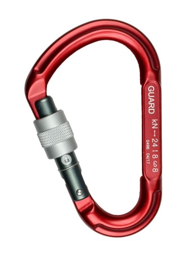 Korpus karabinka HMS Guard został wykonany z wysokiej jakości stopów lekkich. Zapewniło to niewielką wagę przy zachowaniu świetnej wytrzymałości. Dopracowany, ergonomiczny profil sprzyja wykonywaniu wszelkich operacji sprzętowych, czyniąc z karabinka bardzo poręczne akcesorium niezależnie od tego do czego go wykorzystamy. Nieco wydłużony kształt świetnie sprawdzi się podczas konstruowania systemów do transportu ludzi i ładnków, znacznie ułatwiając poprawne ustawianie się łącznika. Klasyczny, zakręcany zamek jest konstrukcją bezząbkową typu Keylock. Dzięki temu wyeliminowano ryzyko przypadkowego zahaczenia o taśmy, pętle bądź inne elementy ekwipunku. Nakrętka zamka została pokryta specjalną perforacją, dzięki czemu bez trudu obsłużymy ją nawet mokrymi bądź brudnymi dłońmi, a także w rękawicach. Spory prześwit ułatwia przepinanie, a estetyczna kolorystyka pozwala wyróżnić karabinek, dzięki czemu jest on świetnym wyborem do tworzenia bardziej złożonych systemów. Uwagę zwraca także specjalny piktogram na ramieniu, dzięki któremu łatwo ocenimy poprawność zamknięcia zamka.