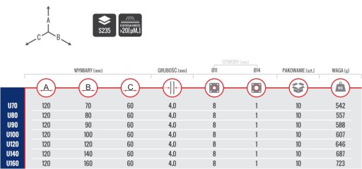 Podstawy słupa typ „U” ułatwiają i przyśpieszają montaż drewnianych słupów do betonowego podłoża za pomocą śrub lub kotew do betonu. Dostępne w wielu rozmiarach odpowiednich dla szerokości mocowanych słupów. Elektrolityczna powłoka cynkowa o grubości min. 20um doskonale chroni przed korozją.