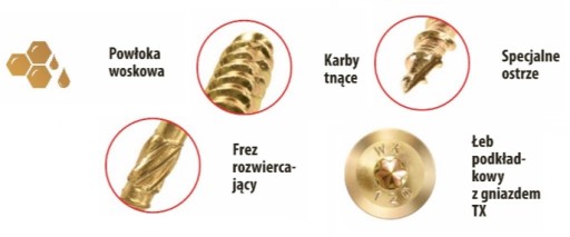 - KARBY TNĄCE Specjalne karby tnące na gwincie przecinają włókna struktury drewna podczas wkręcania.