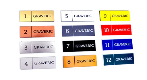 Tabliczki wykonujemy z trwałego laminatu grawerskiego, który dostępny jest w bardzo dużej liczbie kolorów, tutaj laminat srebrny.,