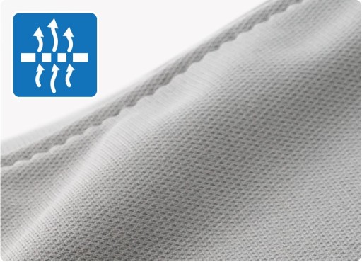 - Wykonany z 100% poliestru o specjalnej strukturze, dzięki czemu materiał świetnie przepuszcza powietrze.
