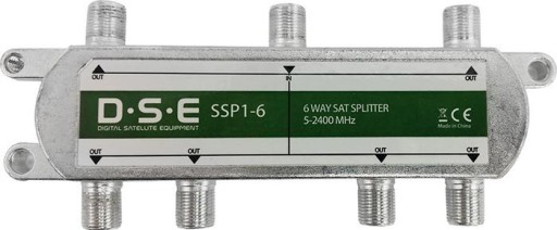 Splitter (rozgałęźnik) sygnału 1/6 posiada 1 wejście i 6 wyjść, zakres pracy 5-2400 MHz. Umożliwia podzielenie sygnału telewizji satelitarnej (unicable), naziemnej lub kablowej na sześć odbiorników.
