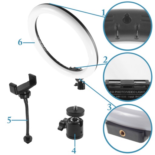 W wewnętrznej części pierścienia istnieje możliwość zamontowania uchwytu na smartfona / Iphone'a a także opcjonalnie mikrofonu. Dodatkowo w tylnej górnej części lampy znajduje się uchwyt do zawieszenia lampy.