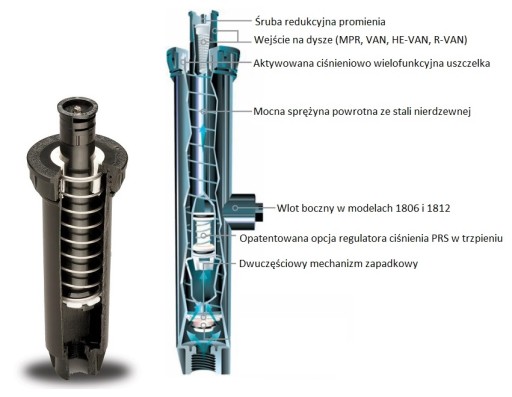 - Korpus kompatybilny z dyszami: seria MPR, VAN, dysze rotacyjne RAIN BIRD i wszystkie dysze do zraszaczy statycznych firmy