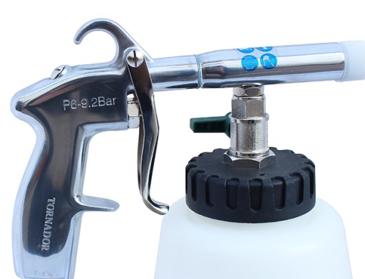 Pistolet TORNADOR GUN Z-010 dociera do wszelkich trudno dostępnych miejsc, gdzie nie dotrze zwykła gąbka, szmatka, szczotka, czy pędzelek. Skuteczny w czyszczeniu na mokro wszelkiego rodzaju zabrudzeń karoserii i wnętrza samochodu: dywaników, tapicerki siedzeń, wylotów powietrza w tym klimatyzacji, elementów lustrzanych i z tworzywa oraz wszelkiego rodzaju trudnego do usunięcia brudu i zanieczyszczeń. Pistolet dzięki specjalnie ukształtowanej dyszy z wirującym rdzeniem, wytwarza pulsacyjne ciśnienie, które rozpyla aktywny środek czyszczący. W ten sposób uzyskuje się tzw. efekt tornada, który z dużą siłą usuwa wszelkie zanieczyszczenia i kurz. Urządzenie czyści wszystkie elementy, przy niewielkim stopniu zwilżenia i minimalnym poziomie zużycia środka czyszczącego, a przy użyciu odpowiedniego środka czyszczącego TORNADOR pozwala na usunięcie plam z czekolady, tłuszczu, kawy, a także sierści i gum do żucia.