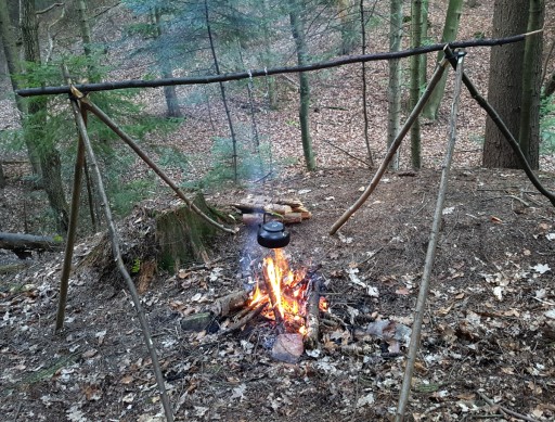 Przy użyciu mocowania można zbudować trójnóg nad ognisko z dostępnych w lesie kijów, gałęzi.