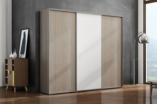 Nowoczesna i pojemna szafa przesuwna z półkami oraz drążkiem na wieszanie ubrań. Szafa trzydrzwiowa.