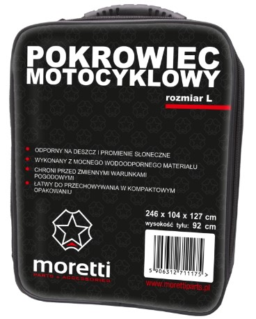 BARDZO WYSOKIEJ JAKOŚCI POKROWIEC MOTOCYKLOWY RENOMOWANEJ FIRMY MORETTI ROZMIAR-L WYKONANY Z TRWAŁEGO I ODPORNEGO NA WSZELKIE CZYNNIKI ATMOSFERYCZNE MATERIAŁU. POKROWIEC JEST TAK ZAPROJEKTOWANY BY ZASŁONIĆ CAŁY MOTOCYKL, QUAD LUB SKUTER ŁĄCZNIE Z LUSTERKAMI i KOŁAMI