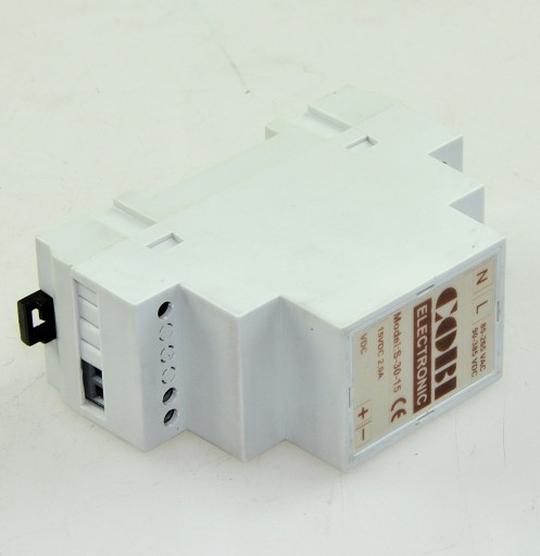 Używany, całkowicie sprawny element o symbolu: S-30-15, produkt firmy COBI. Na wejściu zasilanie 85-265 VAC/90-385 VDC. Wyjście 15 VDC z wydajnością prądu do 2A. Montaż na szynie DIN.