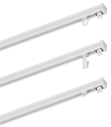 Profesjonalny i funkcjonalny system do zawieszania średnio-ciężkich tkanin. Montaż szyny na suficie jest szybki i prosty (wkręcane kołki mocujące w zestawie).Wytrzymałe wciskane suwaki - odporne na promieniowanie UV. Szyny można łączyć ze sobą w dłuższe odcinki za pomocą łączników ZS .