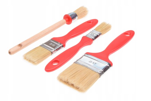 - 3 szt. pędzle włoskie w różnych rozmiarach, które posiadają naturalne włosie ze szczeciny oraz trzonek wykonany z tworzywa sztucznego. Te pędzle również nadaje się do farb olejnych, lakierów oraz emalii.
