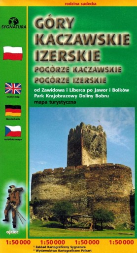 Tzw. ,,poczwórna" mapa (na jednym arkuszu przedstawiono zasięg obszaru, który najczęściej występuje na 4 oddzielnych mapach) Gór Kaczawskich i Izerskich oraz Pogórza Kaczawskiego i Izerskiego w skali 1:50 000.