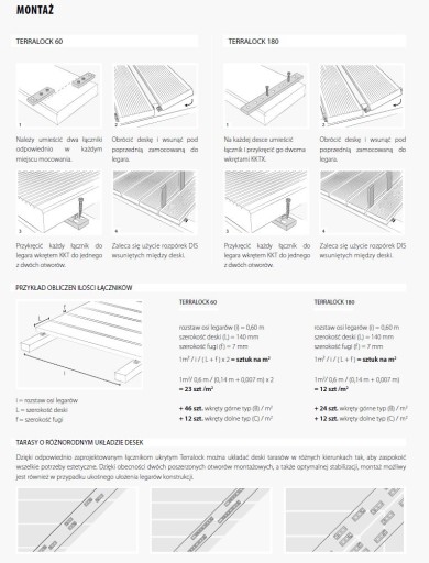 TERRALOCK to system łatwy i szybki w montażu, uniwersalny, do wszystkich typów deski tarasowej i dla różnych gatunków drewna (m.in. modrzew syberyjski, modrzew europejski, sosna, drewno egzotyczne np. bangkirai, massarandupa, garapa, ipe, akacja, robinia akacjowa, daglezja i inne). System nadaje się także do montażu desek elewacyjnych o kształcie romboidalnym (Rhombus) lub o kształcie S4S (deska gładka).