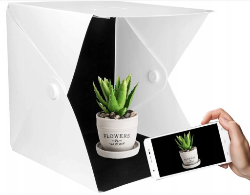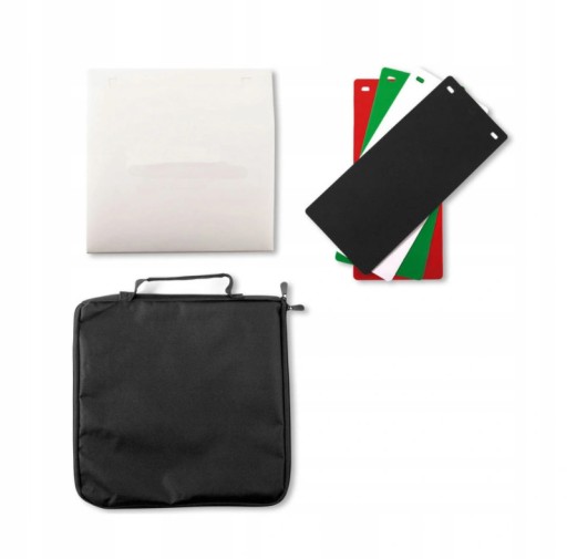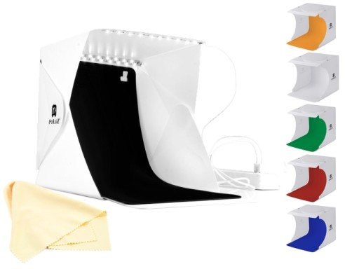 Zestaw do wykonywania zdjęć bezcieniowych spakowany w mały, przenośny futerał. We futerale znajduje się: namiot bezcieniowy o wymiarach po rozłożeniu 24 x 23 x 22 cm, 2 wbudowanych paneli LED (20 diod LED w każdym panelu) zasilanych przez kabel micro USB, 6 teł fotograficznych (czarnego, białego, pomarańczowego, zielonego, niebieskiego oraz czerwonego) i 2 kabli USB do zasilania paneli LED. Zestaw jest w pełni wystarczalny do wykonywania zdjęć bezcieniowych małych produktów na potrzeby katalogów, aukcji internetowych, książek, czasopism itd.