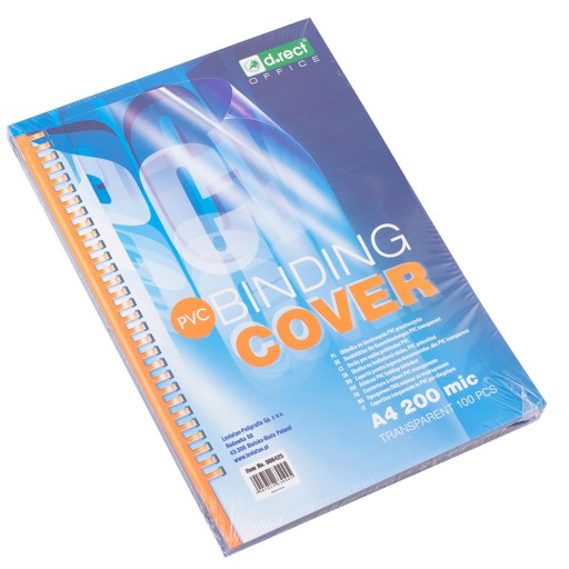 Okładka wykonana z przeźroczystej folii PVC 200 mic w formcie A4, przeznaczona do bindowania dokumentów, chroni arkusze przed zniszczeniem i zalaniem. Może być stosowana wraz z okładką skóropodobną oraz grzbietem do oprawy dokumentów za pomocą bindownicy. Używana jest również w zestawie z okładką skóropodobną i listwą zaciskową, co stanowi najszybszy sposób oprawy wszelkich niedziurkowanych wydruków - doskonale sprawdza się podczas szkoleń, konferencji oraz w codziennej organizacji biura. Okładka podnosi estetykę oprawy. W opakowaniu 100 arkuszy.