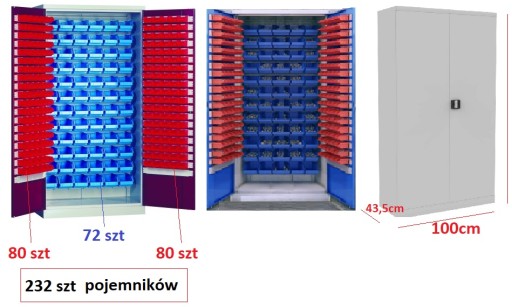 Wszystkie elementy szafy wykonane z blachy stalowej gr.1,0 mm. Drzwi ze schowanymi zawiasami. Uchwyt drzwiowy z zamkiem zabezpieczającym z ryglowaniem w dwóch punktach. Szafa wyposażona w listwy do mocowania pojemników narzędziowych o wymiarach 108 x 144 x 224 /170 mm (72 sztuki) na ścianie tylnej i o wymiarach 56 x 77 x 119 /90 mm (po 80 sztuk) na drzwiach szafy. Szafa dostarczana z pojemnikami.