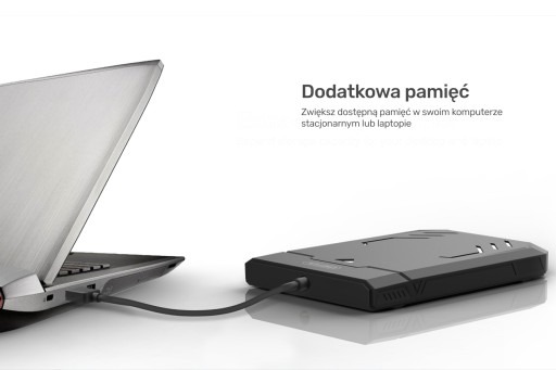 Obudowa jest zaprojektowana tak, że nie potrzebujesz żadnych narzędzi do wymienienia zamontowanego dysku. Dzięki szybkiemu podłączeniu możesz w przyszłości zmienić dysk na nowy model bez kupowania nowej obudowy. Specjalne zaprojektowane otwory ułatwiają odprowadzanie ciepła i nadają jej dynamiczny, gamingowy wygląd. Zasilana bezpośrednio z portu USB, nie wymaga noszenia ze sobą niewygodnych zasilaczy sieciowych. Ponadto adapter jest wyposażony w technologię Plug&play, więc dysk nie potrzebuje dodatkowych sterowników.