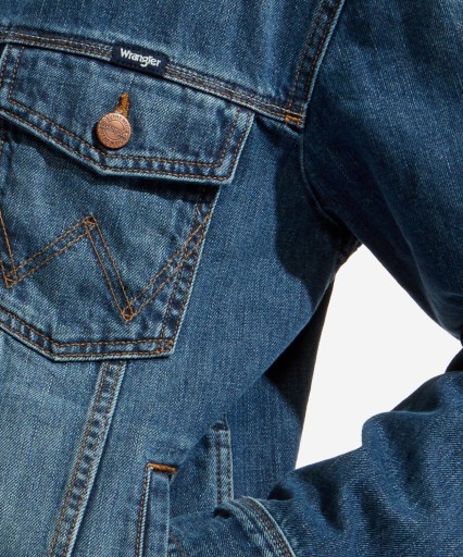 Tradycyjna kurtka jeansowa Wranglera w jasnym odcieniu błękitu z dwiema kieszeniami na piersiach, wykończona kowbojskimi akcentami, z dzielonym kołnierzem. Luźny krój, idealny do warstwowych stylizacji.