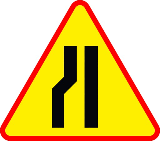 Ostrzega o występującym po lewej stronie jezdni zwężeniu, które może powodować utrudnienia ruchu.