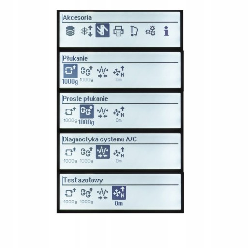 - Test wagi: urządzenie jest wyposażone w wewnętrzną wagę do dokładnego pomiaru odzyskanego i naładowanego czynnika chłodniczego oraz dodatkowa waga oleju tym menu można przetestować wagę poprzez sprawdzenie ciężaru próbki.