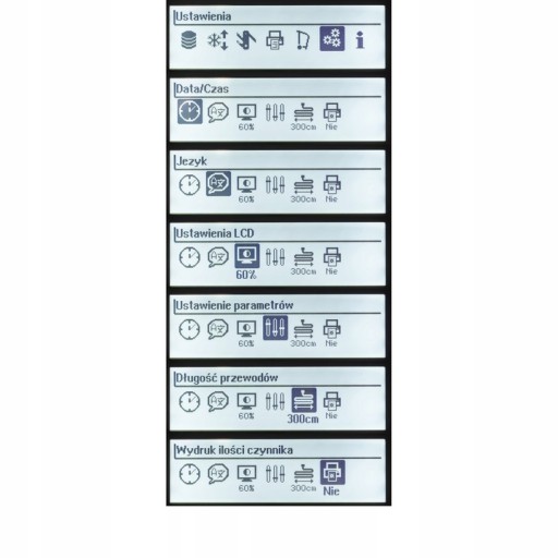 Ustawienia:regulacja podstawowych parametrów, jak np. zmiana długości przewodów (gdy podpinamy przewody o innej długości niż fabrycznie zamontowane) co pozwala nam na serwisowanie pojazdów z utrudnionym dostępem np. pojazdów rolniczych