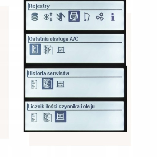 - podgląd do "przebiegu" maszyny, czyli ilość napełnień zbiornika, stan zużycia filtra czynnika, ilość odzyskanego i napełnionego czynnika, czas pracy pompy próżniowej