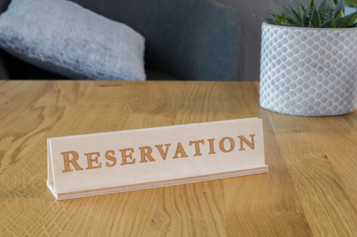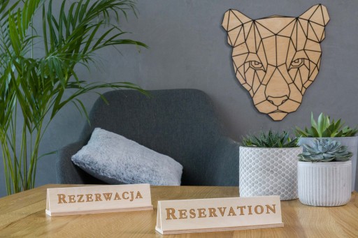Dwie Drewniane tabliczki przymocowane do solidnej podstawki z wyraźnymi grawerowanymi napisami REZERWACJA / RESERVATION.