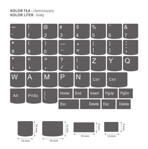 - Rozmiar pojedynczej naklejki na klawisz wynosi 14 mm x 14 mm, rozmiar mniejszych przycisków ukazuje zdjęcie.