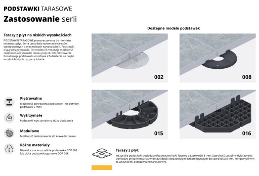Posiadamy pełny system montażu płytek tarasowych z przeznaczeniem do różnych zastosowań i przypadków technicznych: