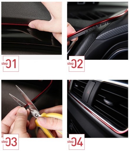 Montaż listwy jest wyjątkowo prosty i intuicyjny, co sprawia, że każdy może samodzielnie dokonać tej zmiany w swoim samochodzie. Wystarczy przyciąć listwę do pożądanej długości, a następnie za pomocą dołączonej szpatułki umocować ją w odpowiednich szczelinach. Listwa jest giętka ale twarda i na zagięciach należy przyciąć czarną część taśmy. W przypadku większych szczelin można użyć taśmy dwustronnej, aby zapewnić dodatkową stabilność.