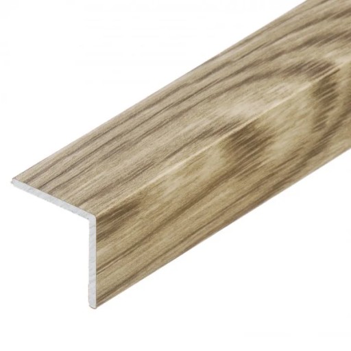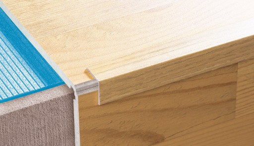 - Profil aluminiowy pokryty drewnopodobną okleiną ochrania krawędzie stopni schodowych pokrytych drewnem lub panelami.