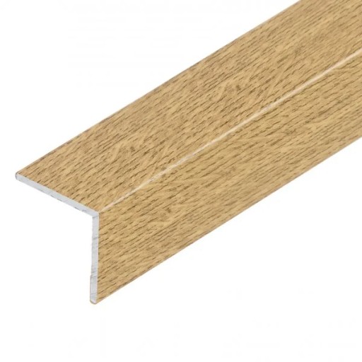 - Profil aluminiowy pokryty drewnopodobną okleiną ochrania krawędzie stopni schodowych pokrytych drewnem lub panelami.