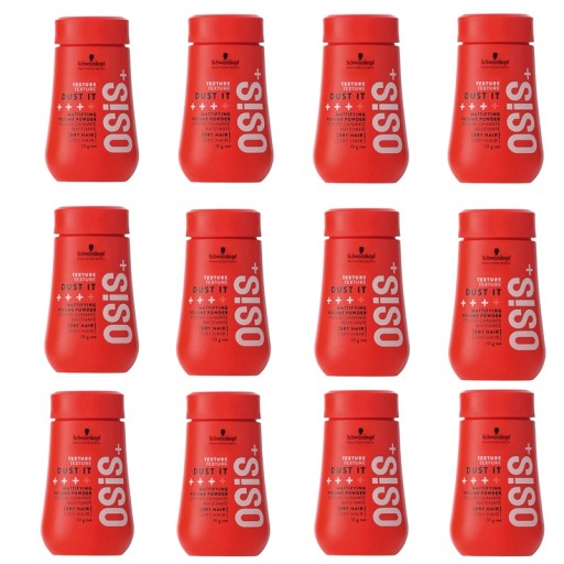 W skład zestawu wchodzi 12 opakowań pudru Schwarzkopf Osis Dust It, każde o pojemności 10g.