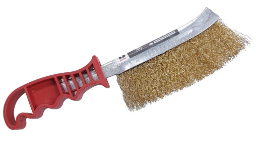 Szczotka wykonana z drutu mosiądzowanego karbowanego. Służy do czyszczenia powierzchni metalowych, drewnianych z rdzy, starych powłok lakierów czy farb. Wyprofilowany plastikowy uchwyt.